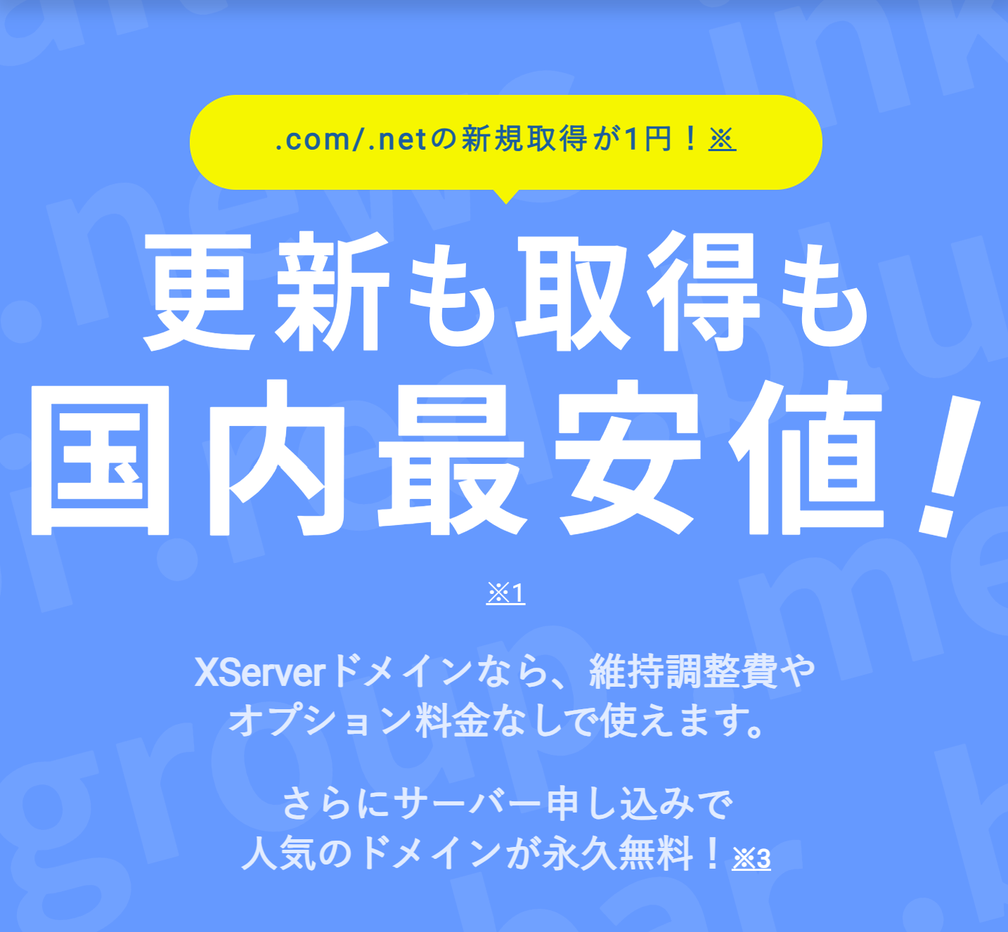人気の「.com」や「.net」などが、1円で取得できる破格のキャンペーンを常時実施。